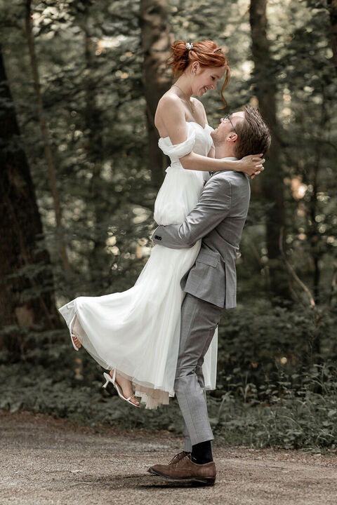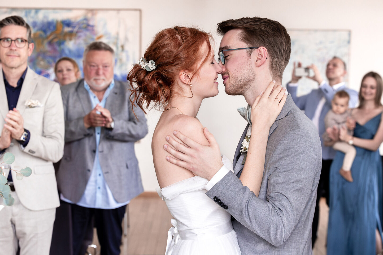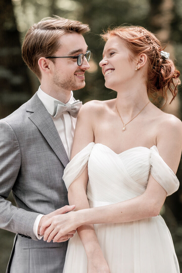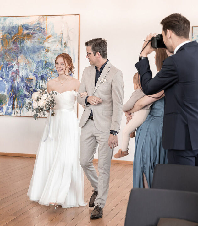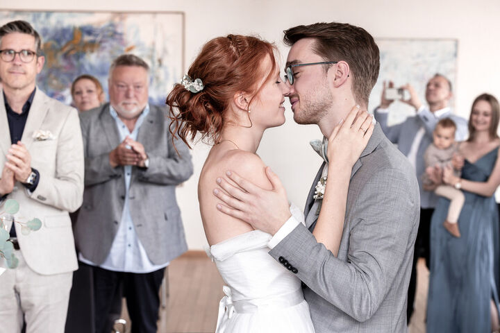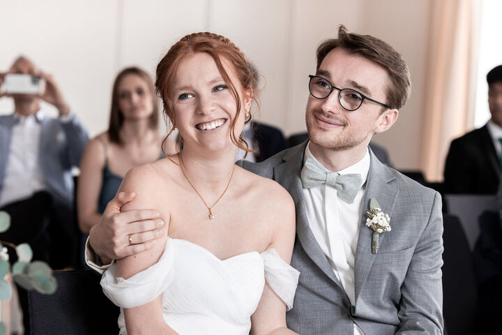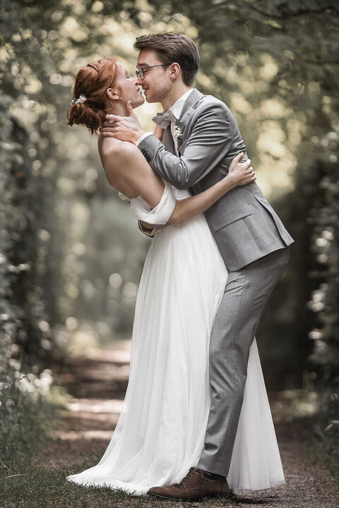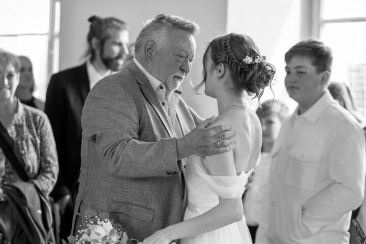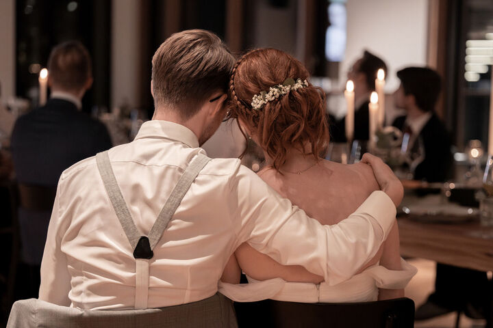 Als ich nach meinem Locationcheck im Hof des Schlosses die beiden sah, war ich sofort verzaubert. Merves Brautkleid war schlicht und modern, perfekt passend zur Braut, während Arne mit einem außergewöhnlichen Anzug glänzte. Die Liebe und Magie zwischen den beiden war sofort spürbar, besonders bei der Trauung, wo ich diese innigen und emotionalen Momente festhalten konnte.
